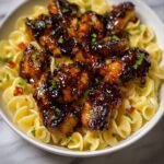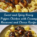 A delightful Sweet and Spicy Honey Pepper Chicken served over creamy macaroni and cheese. This dish combines tender chicken breasts glazed in a flavorful honey soy pepper sauce with a rich, cheesy macaroni base, perfect for a comforting and satisfying meal.