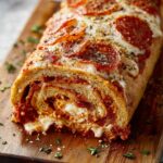 This Tremendous Cheesy Pepperoni Stromboli combines layers of melted mozzarella, provolone, and Parmesan cheeses with savory pepperoni, all rolled inside a golden, crispy pizza dough crust. Perfectly seasoned with Italian herbs and garlic powder, this classic Italian-American main course is easy to prepare and perfect for a hearty meal served with marinara sauce for dipping.