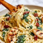 A comforting and creamy Tuscan Chicken and Spaghetti Squash recipe featuring tender chicken pieces in a garlic- and parmesan-infused cream sauce with sun-dried tomatoes and baby spinach. This dish uses spaghetti squash as a healthy, low-carb alternative to pasta, making it a delicious and satisfying meal perfect for a weeknight dinner.