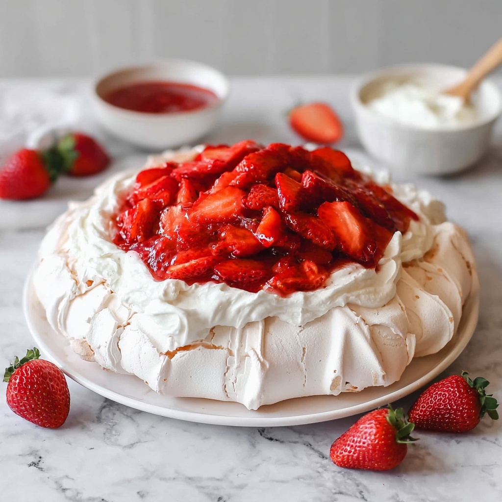 Decorate the pavlova just before serving with a generous swirl of vegan whipped cream and a vibrant pile of fresh strawberries or your favorite seasonal fruits. A drizzle of strawberry coulis adds a tangy-sweet flair that perfectly balances the sweetness of the meringue.