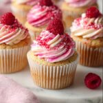 - Pipe Frosting: Fill a piping bag fitted with an open star nozzle alternately with vanilla and raspberry buttercream to create a swirl effect. Pipe the frosting generously on top of each cupcake.