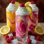 7. Top and Garnish: Spoon a generous dollop of the whipped pink cream onto each glass. Garnish with fresh raspberries and a slice of lemon on the rim for a beautiful presentation.